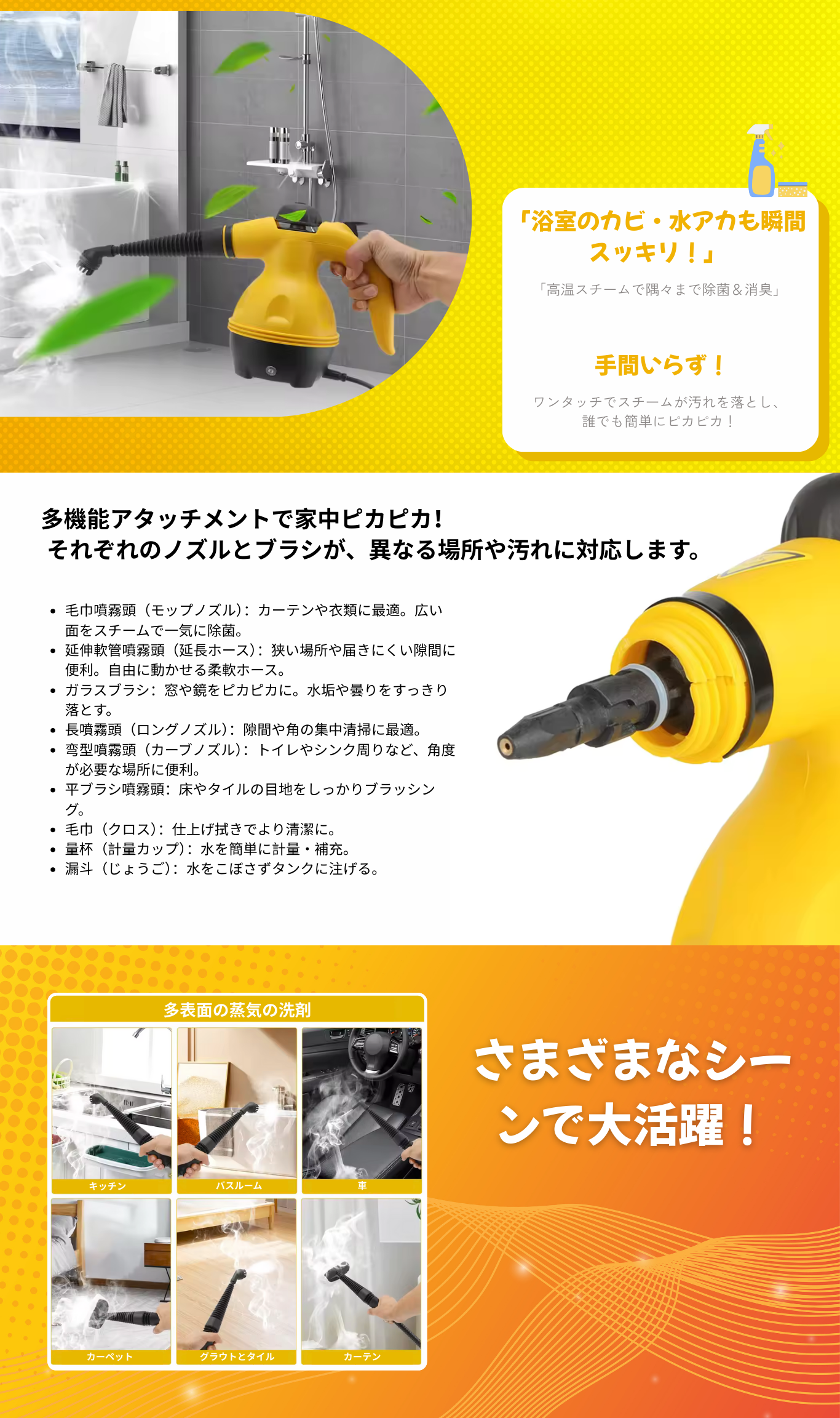タンクに水を入れて電源を入れるだけで、約30秒で高温スチームが発生します。布製品、キッチン、バスルーム、ガラスなどの汚れを簡単に落とせます。