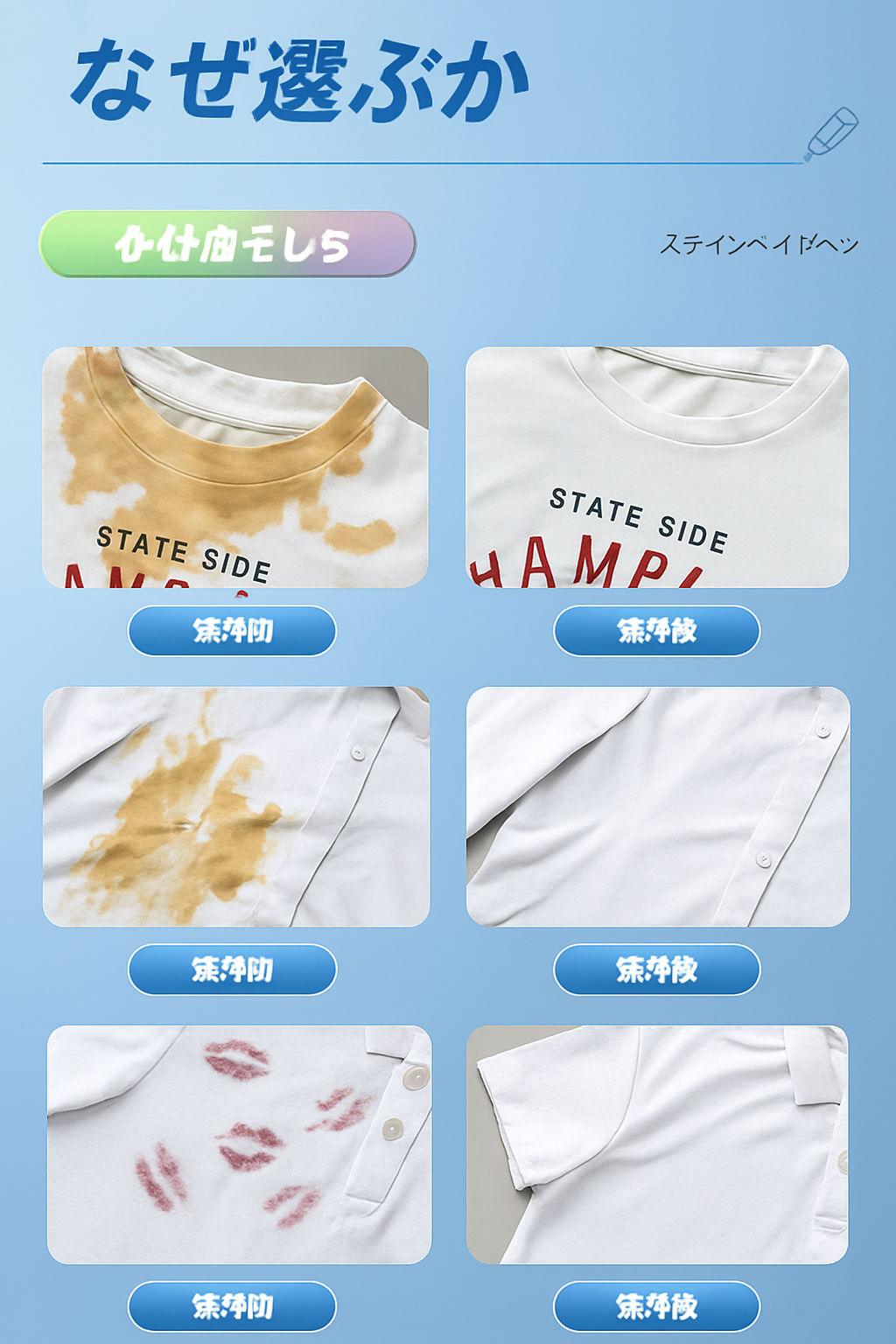 ジュース、ソース、コーヒー、油汚れ、化粧品など、一般的な汚れを除去できます。特に食べ物やワインによる新しい汚れに効果的です。インクや万年筆の文字などの濃い汚れには推奨されません。